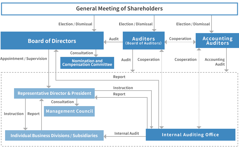 Based on the internal auditing regulation, the Internal Auditing Office, under the direct supervision of the President, audits each division and major subsidiaries in accordance with the annual internal audit implementation plan approved by the President, whether the business is being conducted legally and properly in accordance with the laws, the Articles of Incorporation and internal regulation, and reports the audit results to the President and Auditors.
